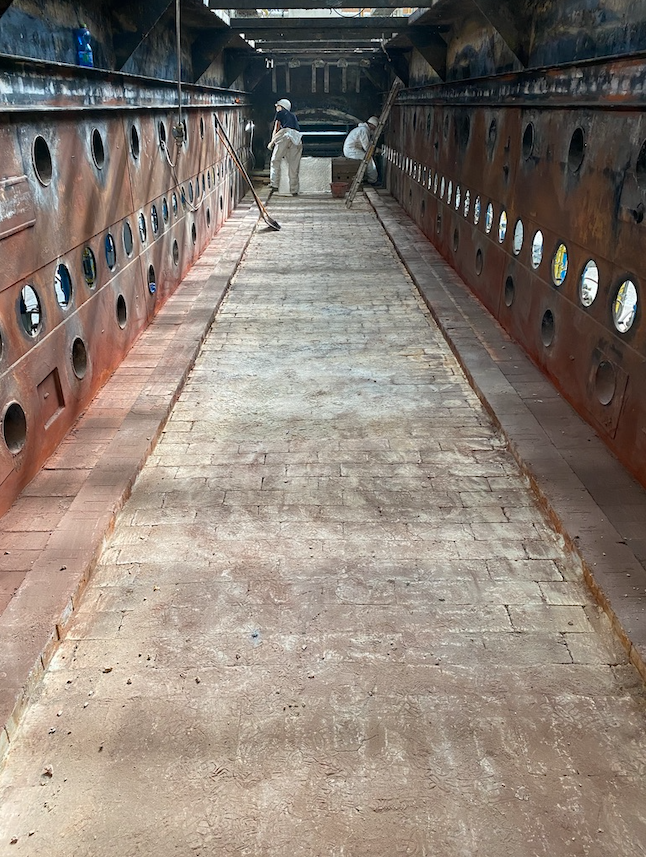 After the demolition of roof, walls and hearth we complete the new refractory lining with hi-tech materials. A brand new roller furnace.